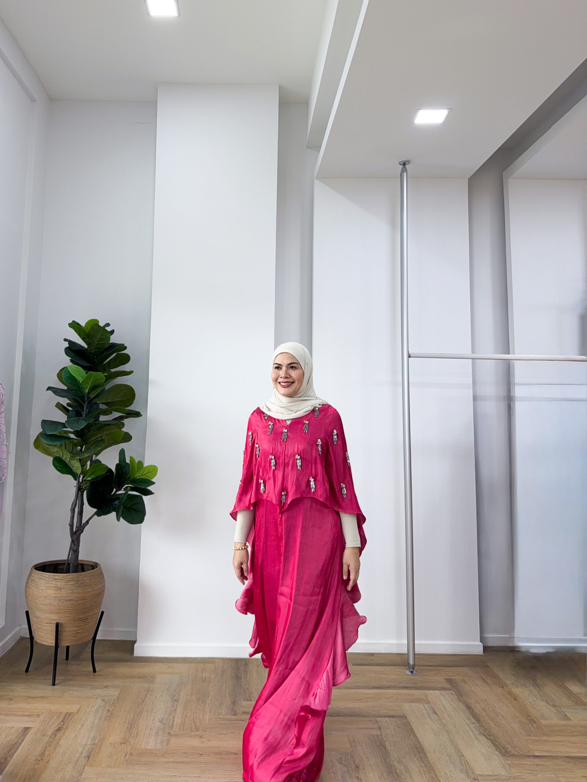A modern twist on our Malaysian favourite house fit; the baju kelawar, our Aryanty kaftan is designed to ease your day through work errands and house chores. With its striking bold colour, it will be super easy and fun for you to mix and match your shoes, bags and even the hijab! The fluidity of this kaftan is the main star – the ruffles on the side flows beautifully, so when you strut the streets, you’ll feel like you’re walking on air. With our Temujanji signature of course, there are hand sewn intricate bead works to add some jazz; just enough for your Raya ootd at home.  A super breezy material, it’s just like your favourite staying at home fit, you wouldn’t want to take it off. Comes in assorted colours, grab one of our Aryanty today!