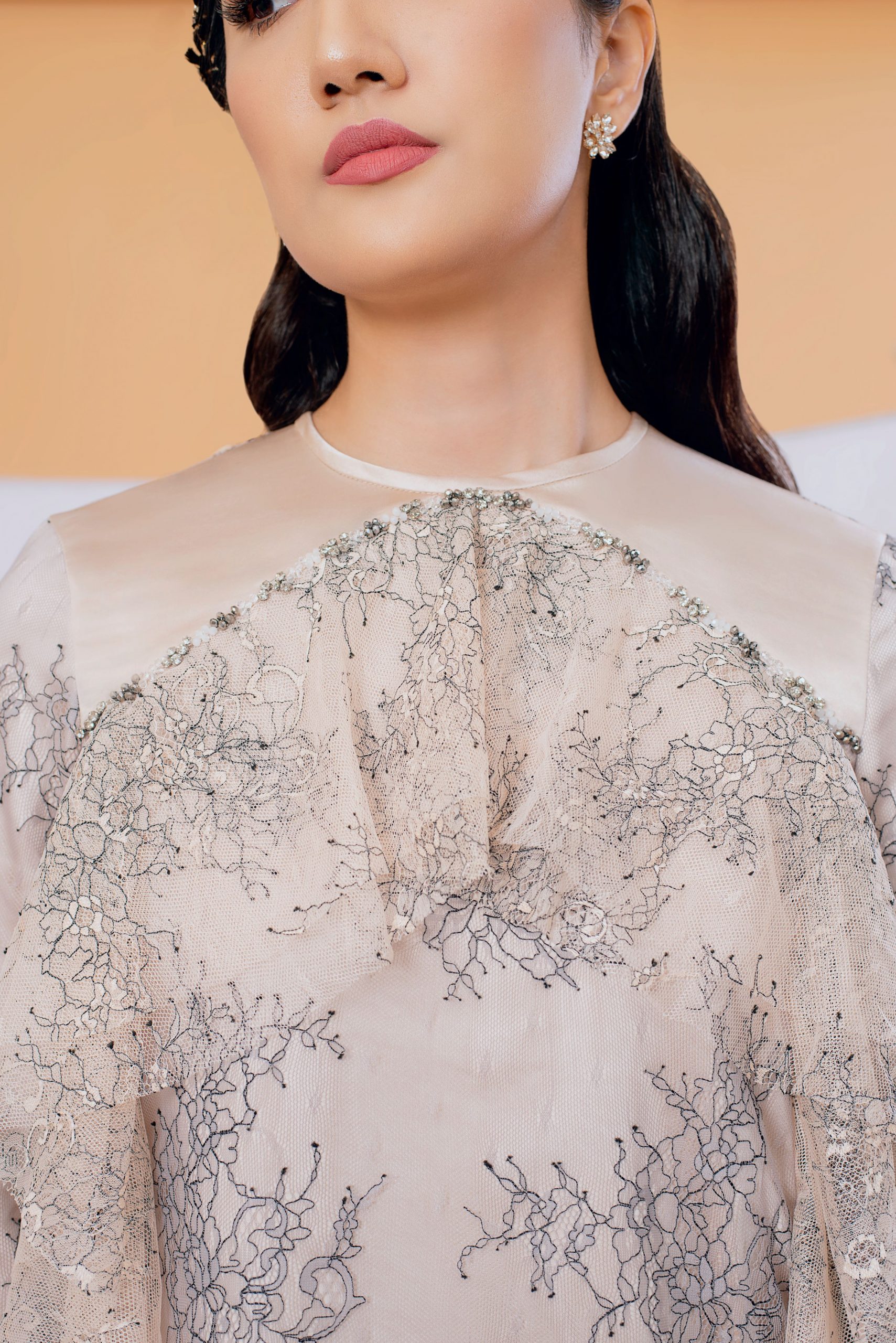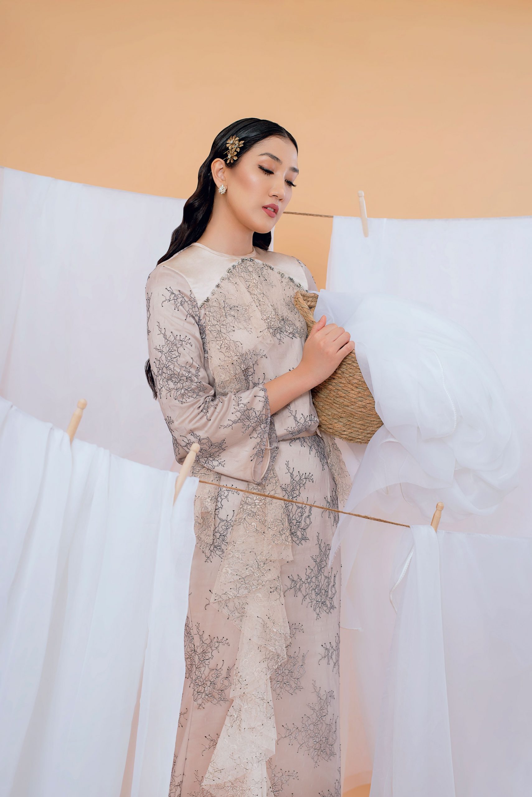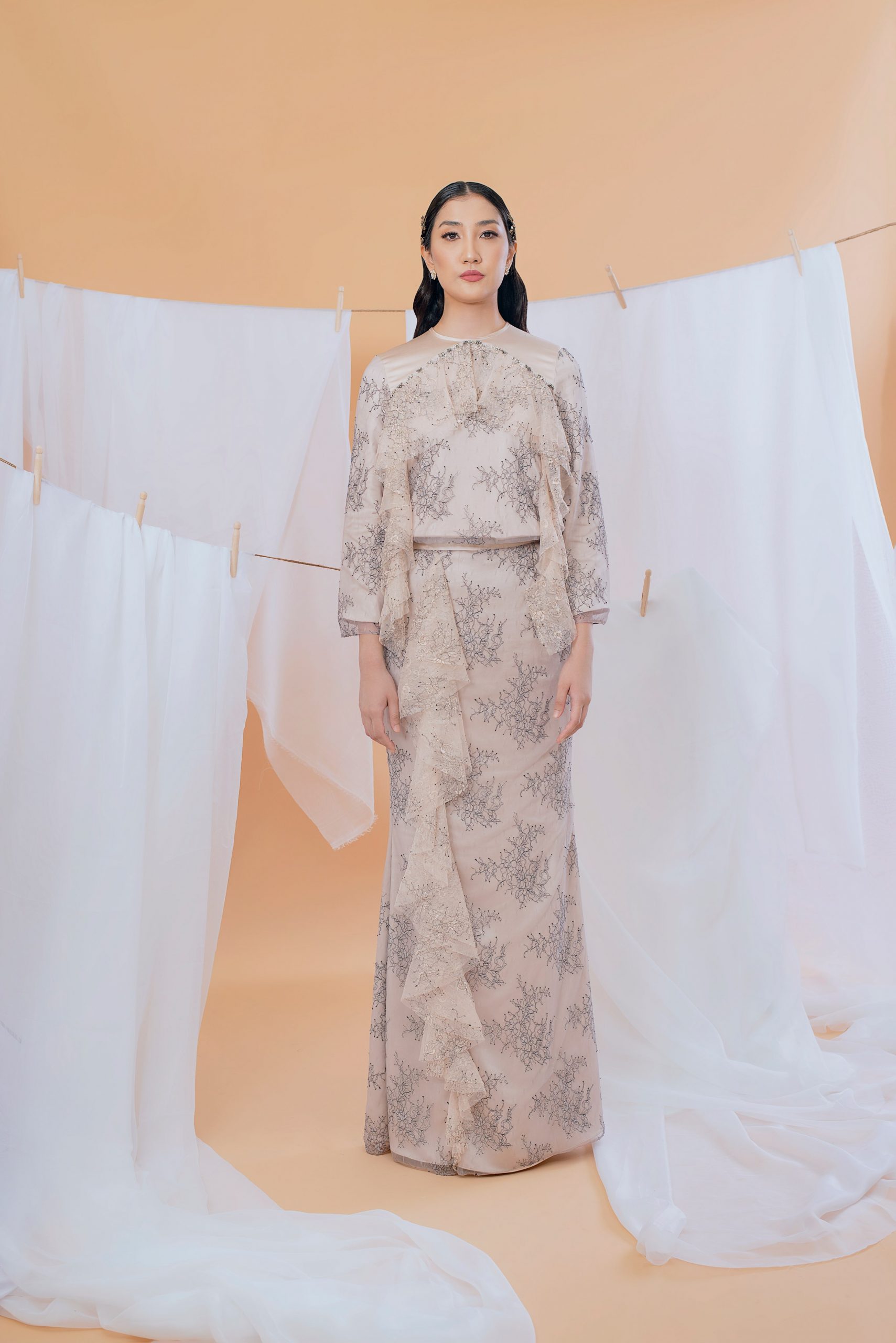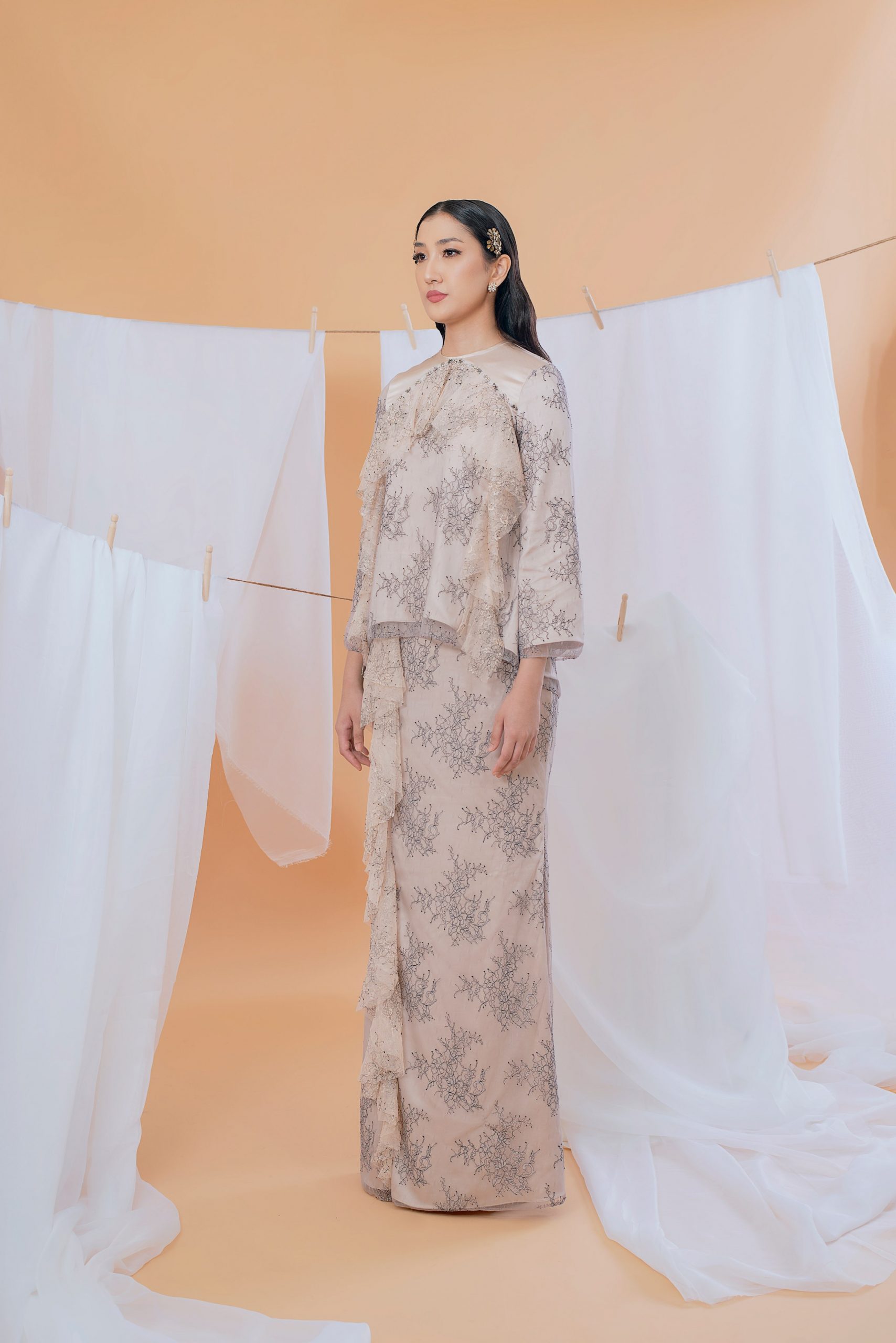 Something sweet to get you by this Raya 2021, as we are coming back with our favourite tucked in look! This time, Dhia is designed with extra ruffles on the top and bottom. Don’t worry about the extra ruffles because it’s designed tastefully to make it look modern and elegant. The high waisted skirt has a drappy effect to elongate your figure. Added on meticulously is some bead works to embedded our Temujanji signature look. You can wear this look tucked and untucked – depending on your mood. Dhia is made for you to look as polished and clean this Raya, so if you need a quick minimalist look, Dhia is the perfect choice for you!
