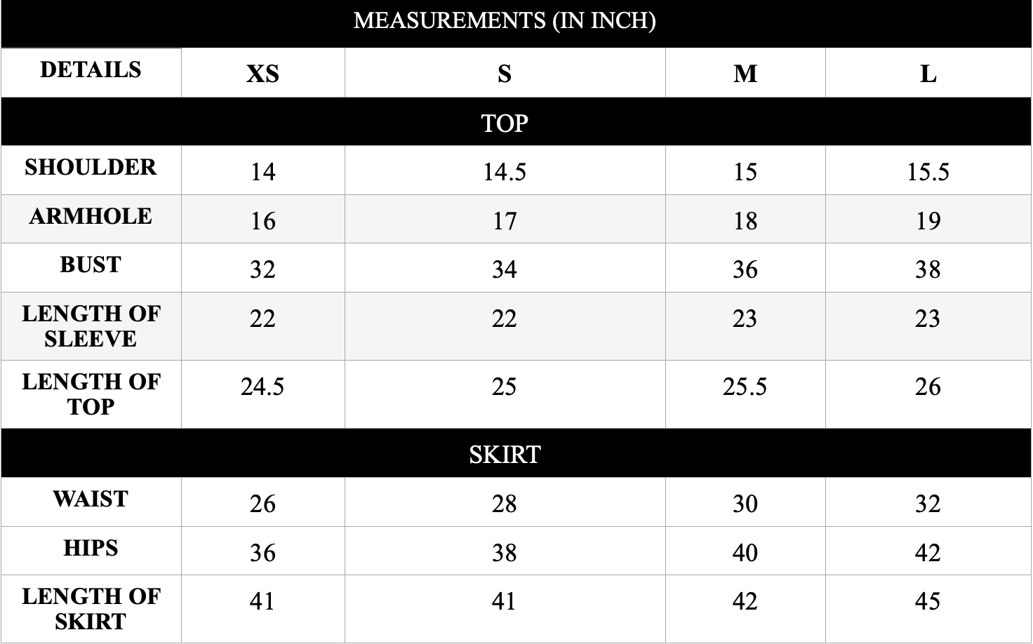- Measurements in inch :