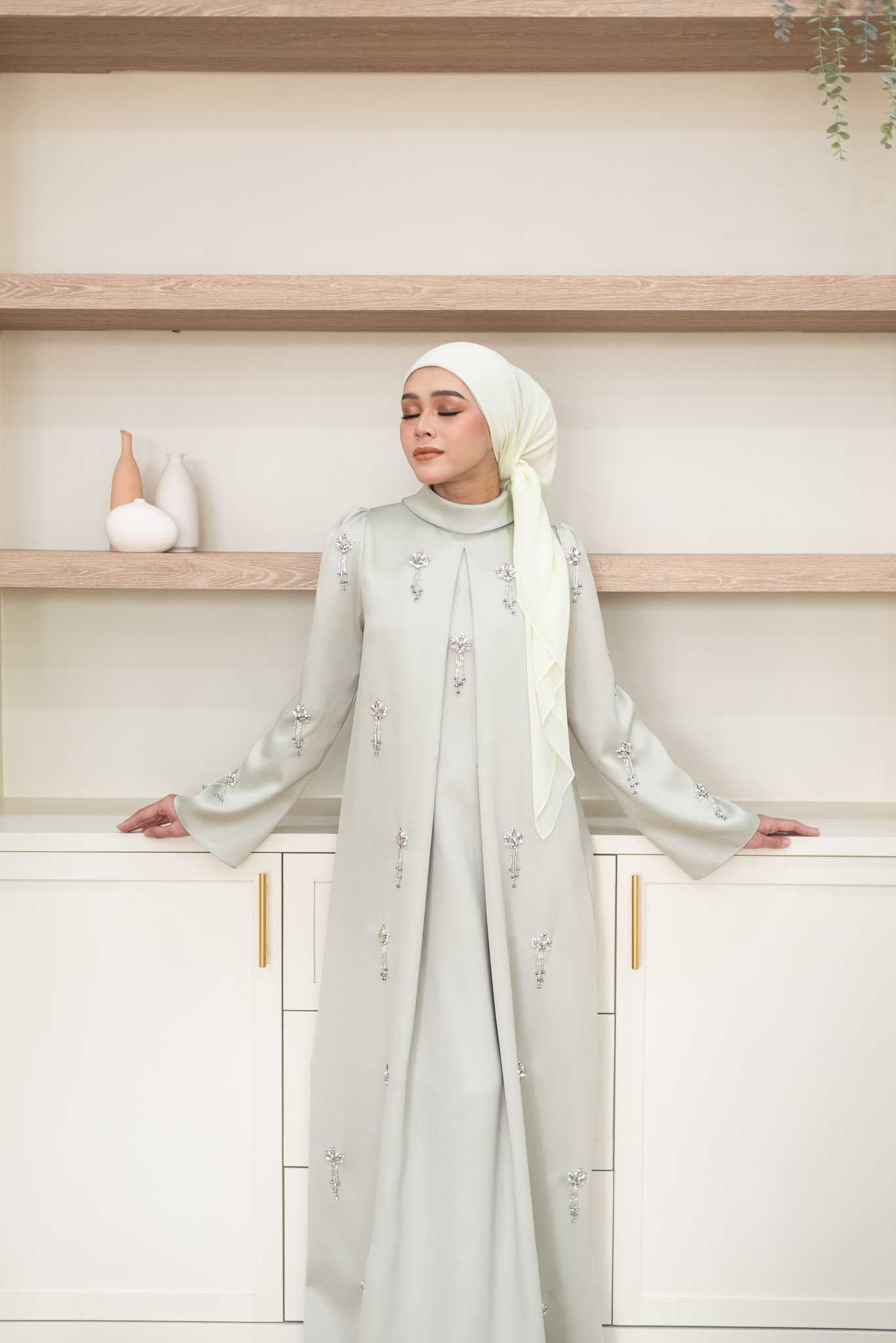 Another trip around the sun, Aidiladha is here once more. A strike of modesty and elegance – this is what we are striving for. This time, we are playing with an exquisite material to give you a more structured gown to go about your day. Adhere to the production of any jubah, this is our elevated version of it. For this auspicious day, we design this Johannah gown with a high neck collar to cover up, a puffy bottom which mimics a ball gown – so you don’t have to worry about it being too fitted for your comfort – and a little hook added to adjust accordingly to your style. And what makes this ours is our hand beaded workmanship – we got you a little dangling action! This gown is completed with our signature puffy shoulder; which is perfect to embody the elegancy odour just like the woman in the Renaissance era. Comes in two sizes which fits all, it’s your turn to make a move; your highness.