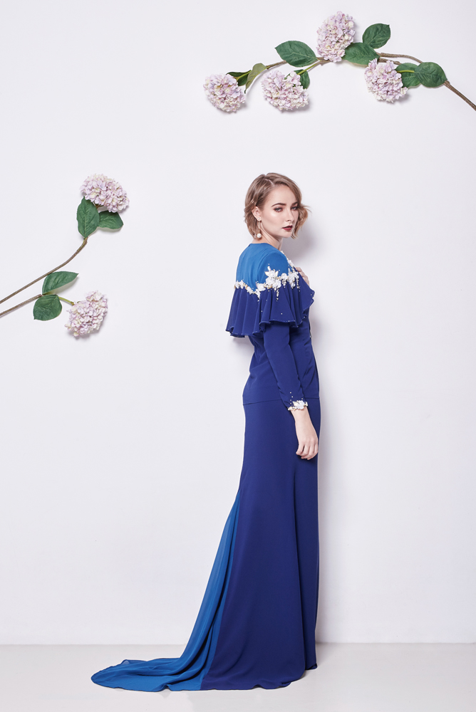 Flowy modern kurung with embellishment on cape and sleeves.