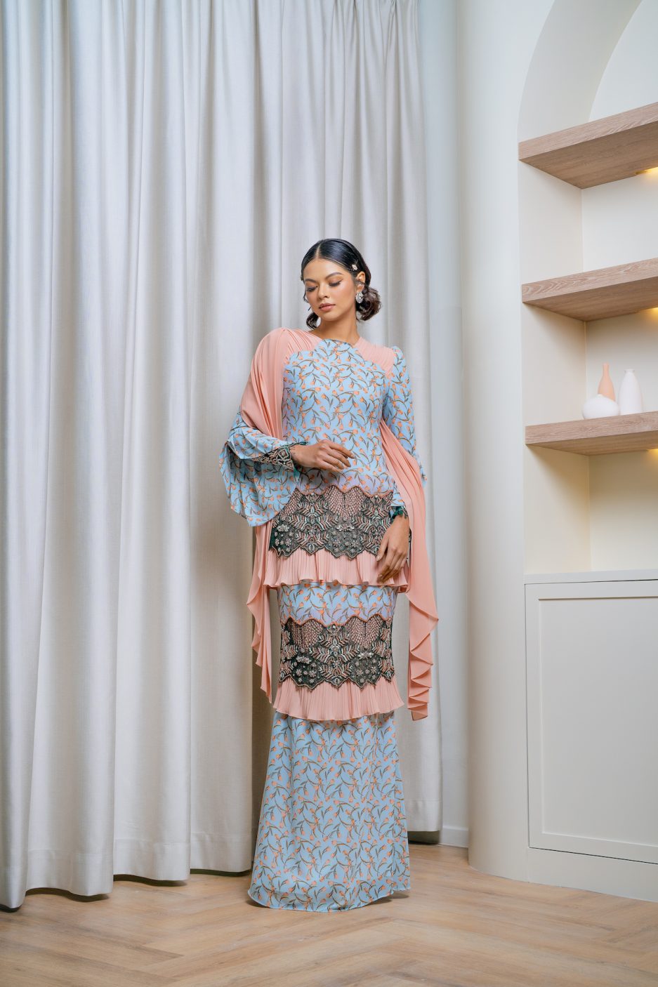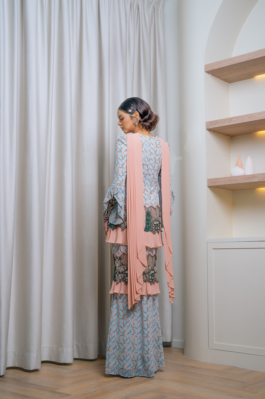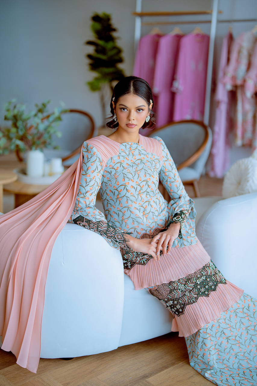 Meticulously designed, Thalia is the epitome of euphoria from this Raya collection. Comes in two alluring colours, these kurung are curated to feed off your luxe need. This is not for the faint-hearted – we got you a pair of wings; well selendang for you to style it in anyway you want. Heavily beaded lace patched on tiers to accentuate Thalia in the best version it can be. Look regal this Raya 2023 with Thalia, you’ll definitely get some heads turn with this piece!Â