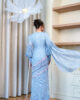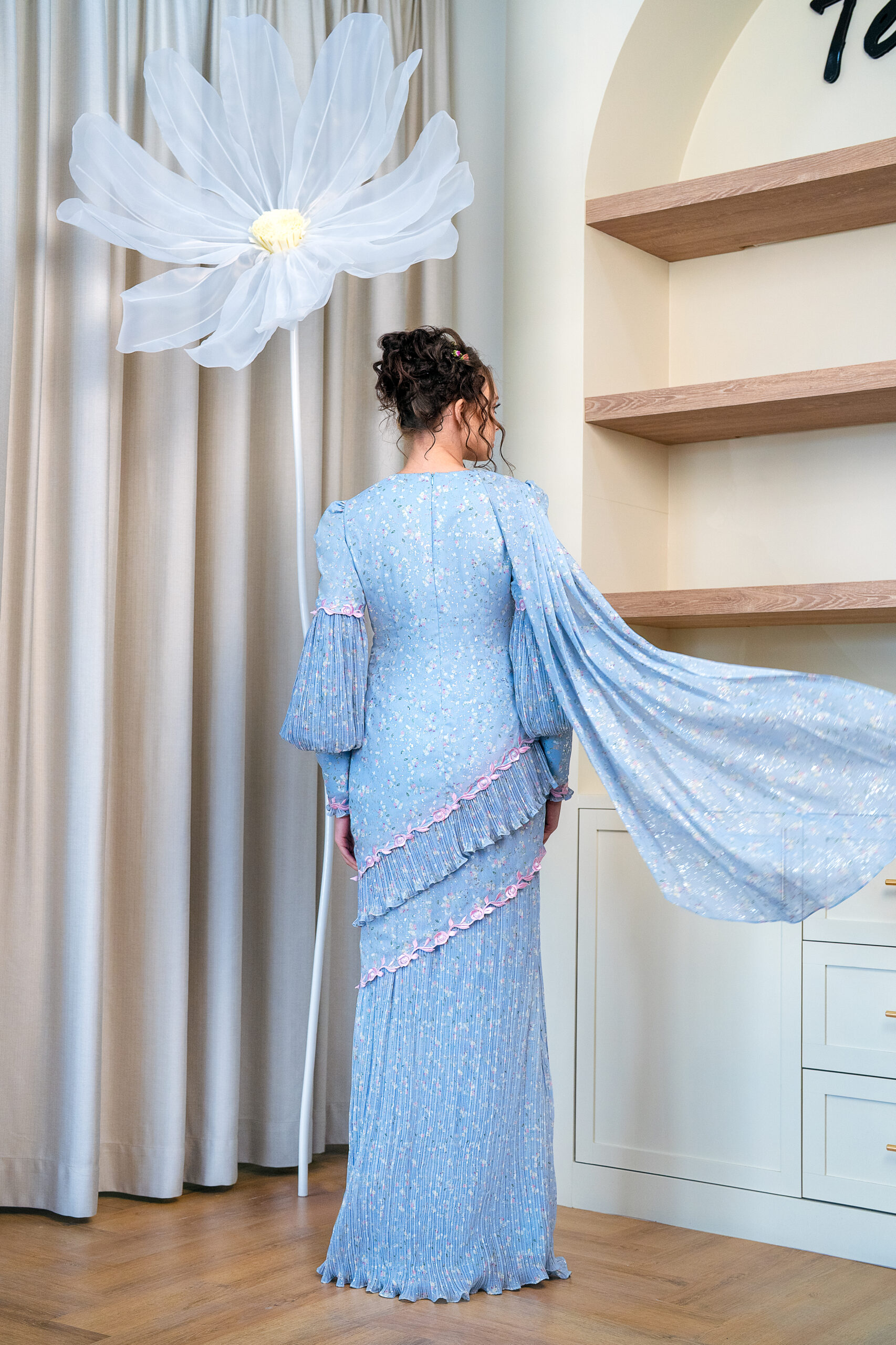 One of our favourites this year, we just love every element embedded on this piece. She’s distinctly the star of the show this year and we are just so excited to see this out there. Encapsulating the essence of ethereal beauty, this piece speaks for itself. What’s a Temujanji piece without our embroidered design? Also spot our hand beaded beadwork too! If that’s not extra enough, we even place a shawl for you to style and move around with to get that perfect Raya shot. If you paid attention, you will notice that our kurungs have different necklines too! Asymmetrical look for this one – may come across as intimidating, but the beautiful hue of blue and cream print accentuate the softness we want to present to you. Undoubtedly, this kurung is the perfect embodiment of ethereal beauty. What do you think?