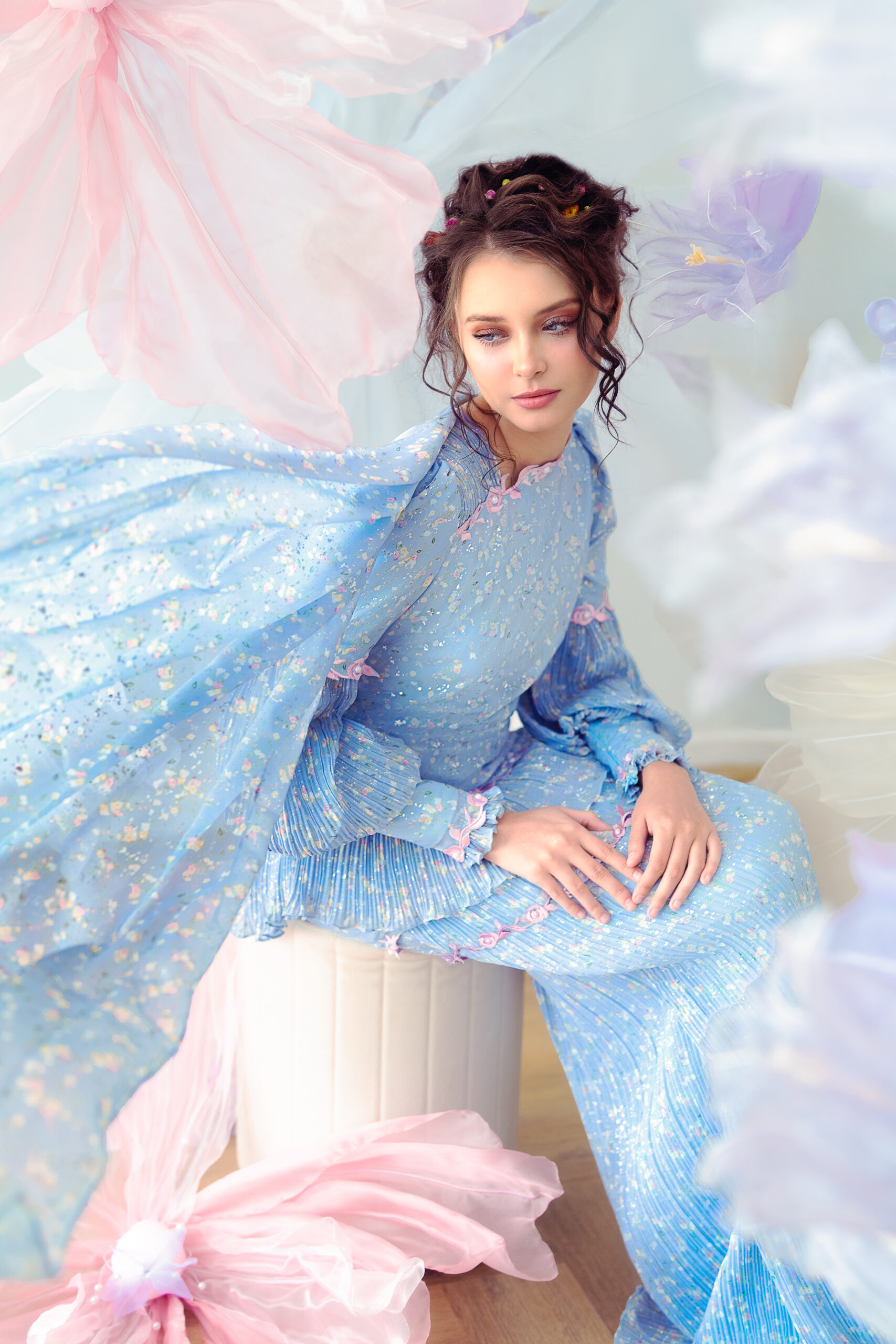 - Material : Printed chiffon and pleats
